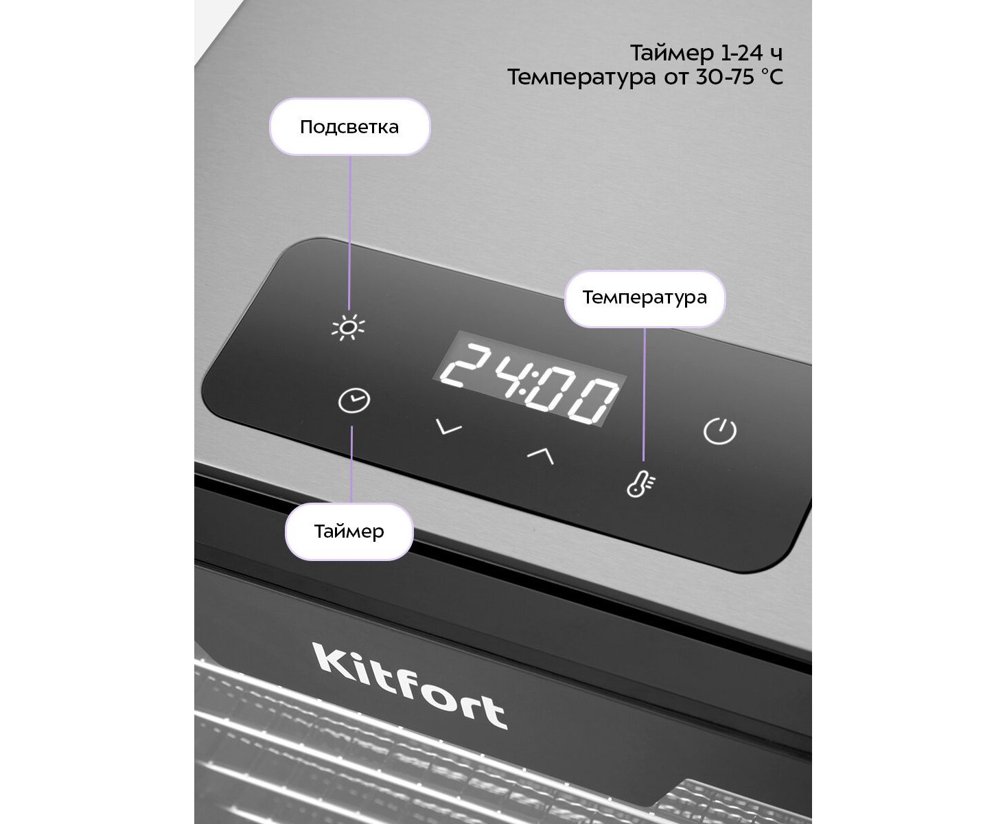 Температуру сушки можно изменить от 30 до 75 °C с шагом 5 °C. Сушилка оснащена таймером от 1 до 24 часов работы с шагом 30 минут. Подсветку камеры сушилки можно включать и выключать во время сушки.