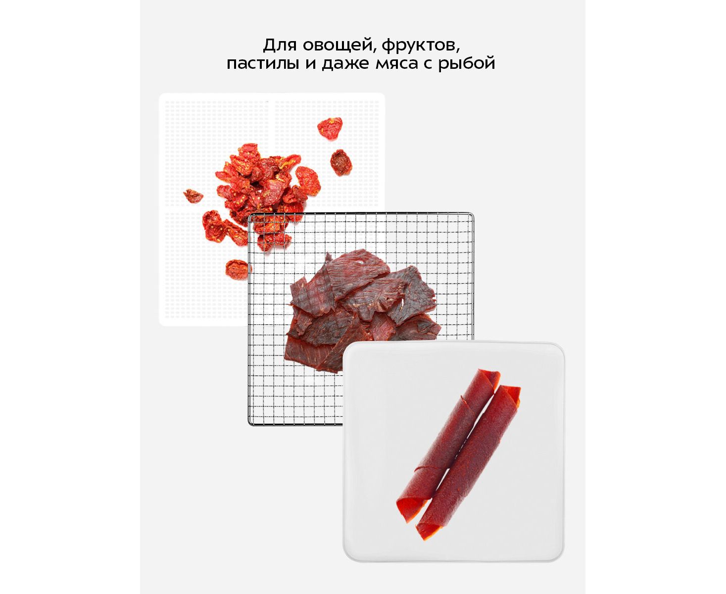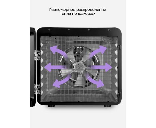 Дегидратор оснащён мощным нагревателем и вентилятором, создающим равномерный горизонтальный обдув по всей камере. Это гарантирует одинаковую сушку продуктов и минимальное смешение запахов при одновременной обработке разных ингредиентов.