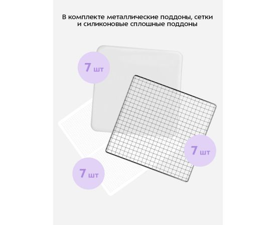 Сушилка комплектуется 7 металлическими, 7 сетчатыми и 7 силиконовыми поддонами, а также поддоном для жидкости. Он собирает сок и крошки во время сушки — просто извлеките и промойте его. Это защищает дно камеры от загрязнений, облегчая уход за устройством.