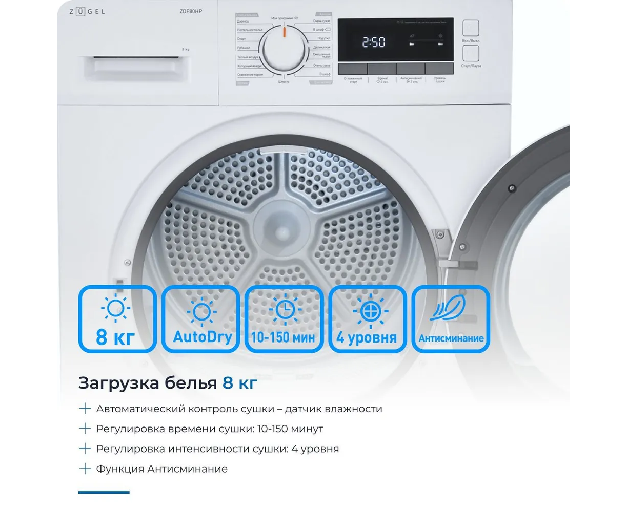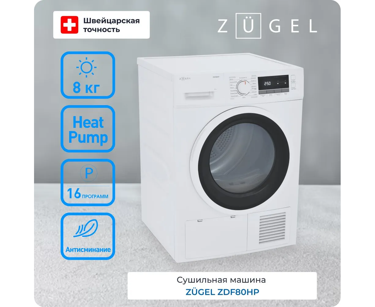 Сушильная машина ZUGEL ZDF80HP Heat Pump с тепловым насосом белая