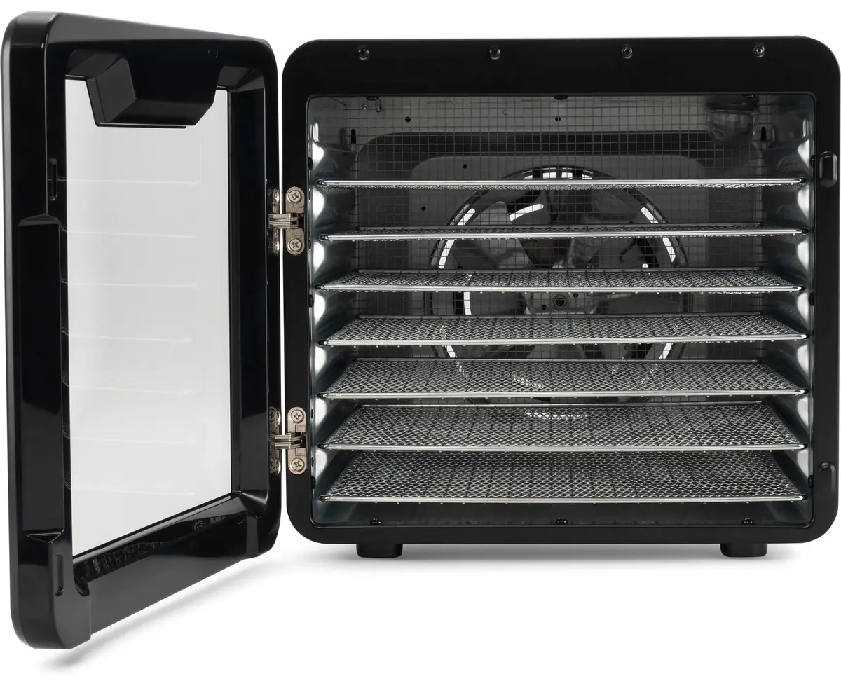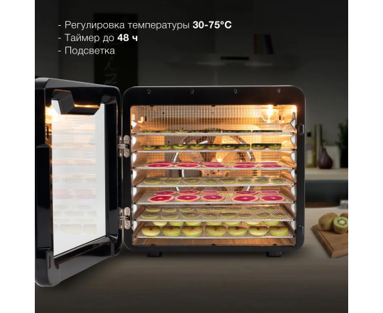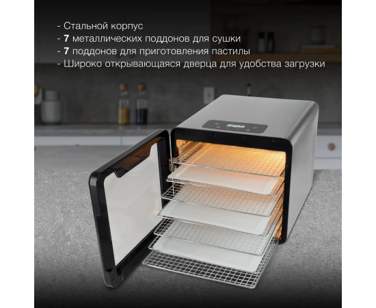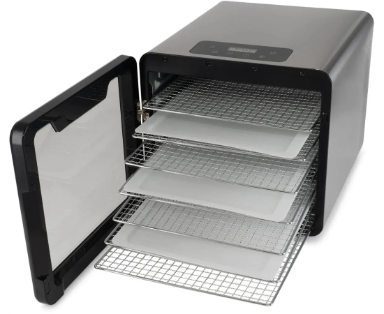 Сушильная камера в металлическом корпусе, с регулировкой температуры и таймером, для сушения овощей и фруктов, грибов и трав, а так же вяленья мяса и рыбы. Весь необходимый функционал, в удобном форм-факторе с сенсорным управлением.
