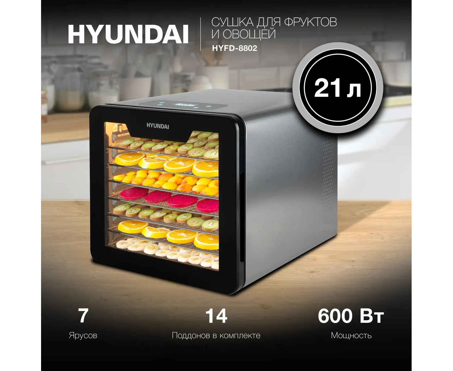 Сушка для фруктов и овощей Hyundai HYFD-8802 14под. серебристый