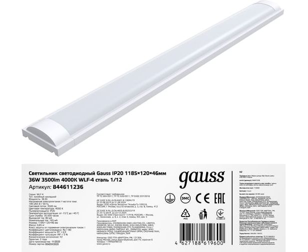 Технические характеристики Gauss WLF-4 36W 3500lm 4000K 185-265V IP20 1185х120х46мм сталь LED2 844611236