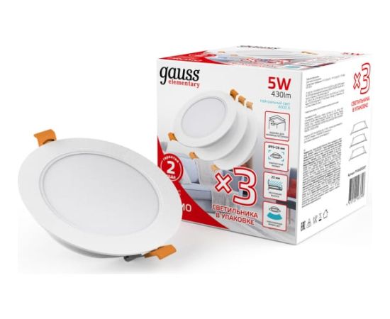 Комплект светильников Gauss Elementary Downlight круг 5W 430lm4000K IP20 95х38 монтаж белыйL 9100420205T подойдет для организации основного освещения в жилых и бытовых помещениях, где необходимо добавить световой акцент.