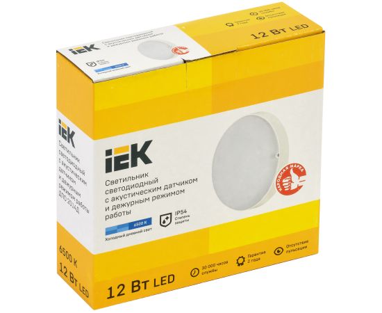 Светильник светодиодный IEK LDPO3-2014D-12-6500-K01 ДПО 2014Д 12Вт IP54 6500К дежурный режим круг белый с акустическим датчиком