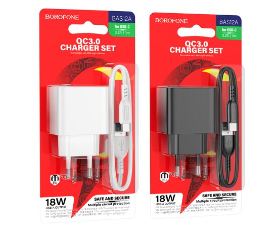 Сетевое зарядное устройство Borofone BAS12A – надежный адаптер с функцией быстрой зарядки, который поможет вам всегда оставаться на связи. Оснащен стандартной сетевой вилкой и USB портом для подсоединения кабеля, что делает его универсальным решением для зарядки смартфонов, планшетов и другой цифровой техники. Блок питания Borofone BAS12A поддерживает функцию быстрой зарядки QC 3.0 и выдает максимальную мощность в 18W. Изготовлен из качественных материалов: огнезащитного PC и ABS-пластика, что обеспечивает безопасность и долговечность использования аксессуара. Поставляется в комплекте с кабелем USB - Type-C длиной 1 м. Вес 64 г. Выполнен в двух цветах.