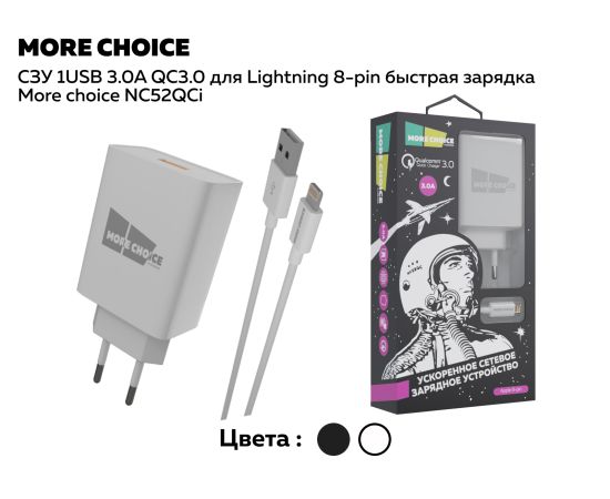 СЗУ 1USB 3.0A QC3.0 для Lightning 8-pin быстрая зарядка More choice NC52QCi (White)