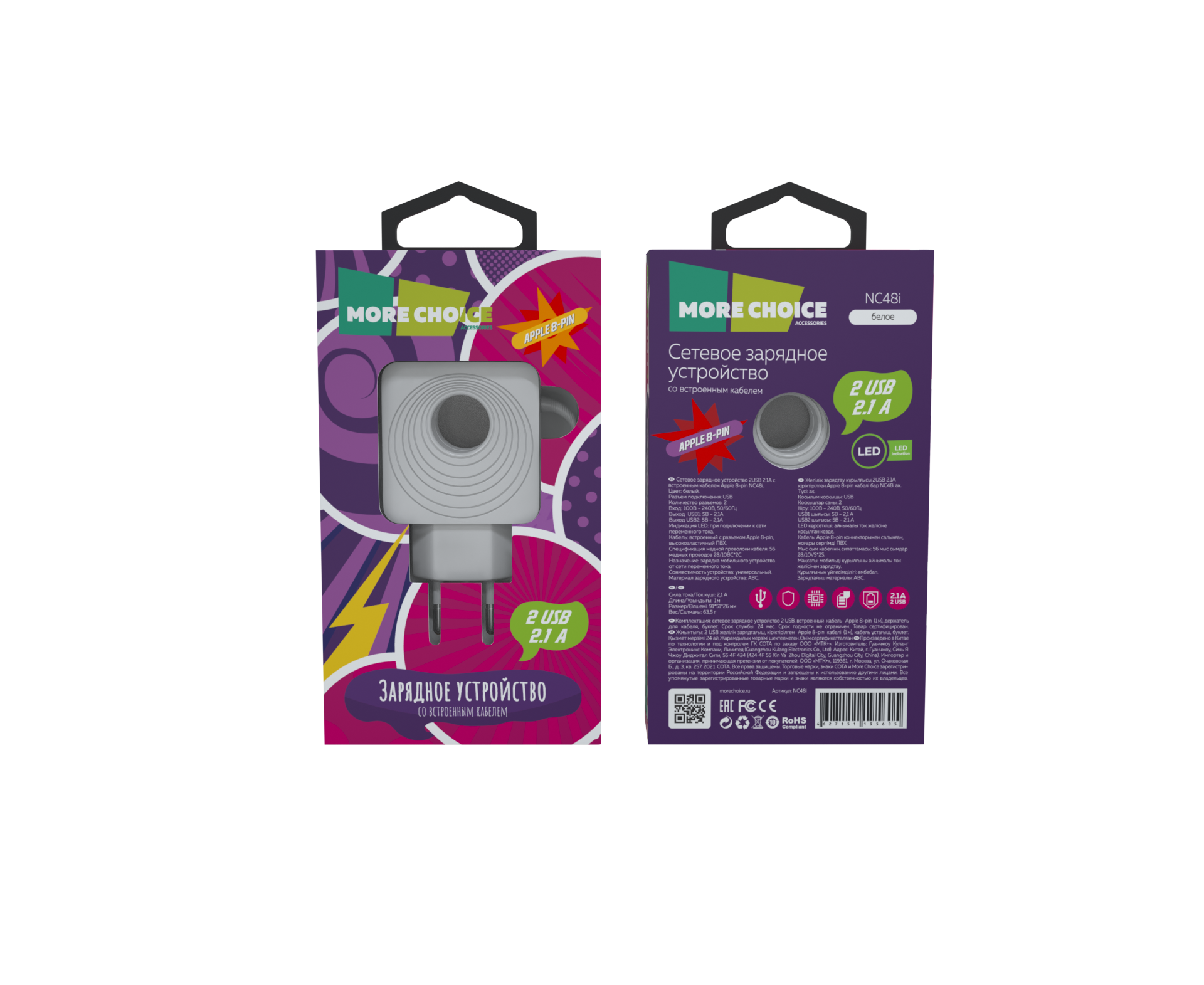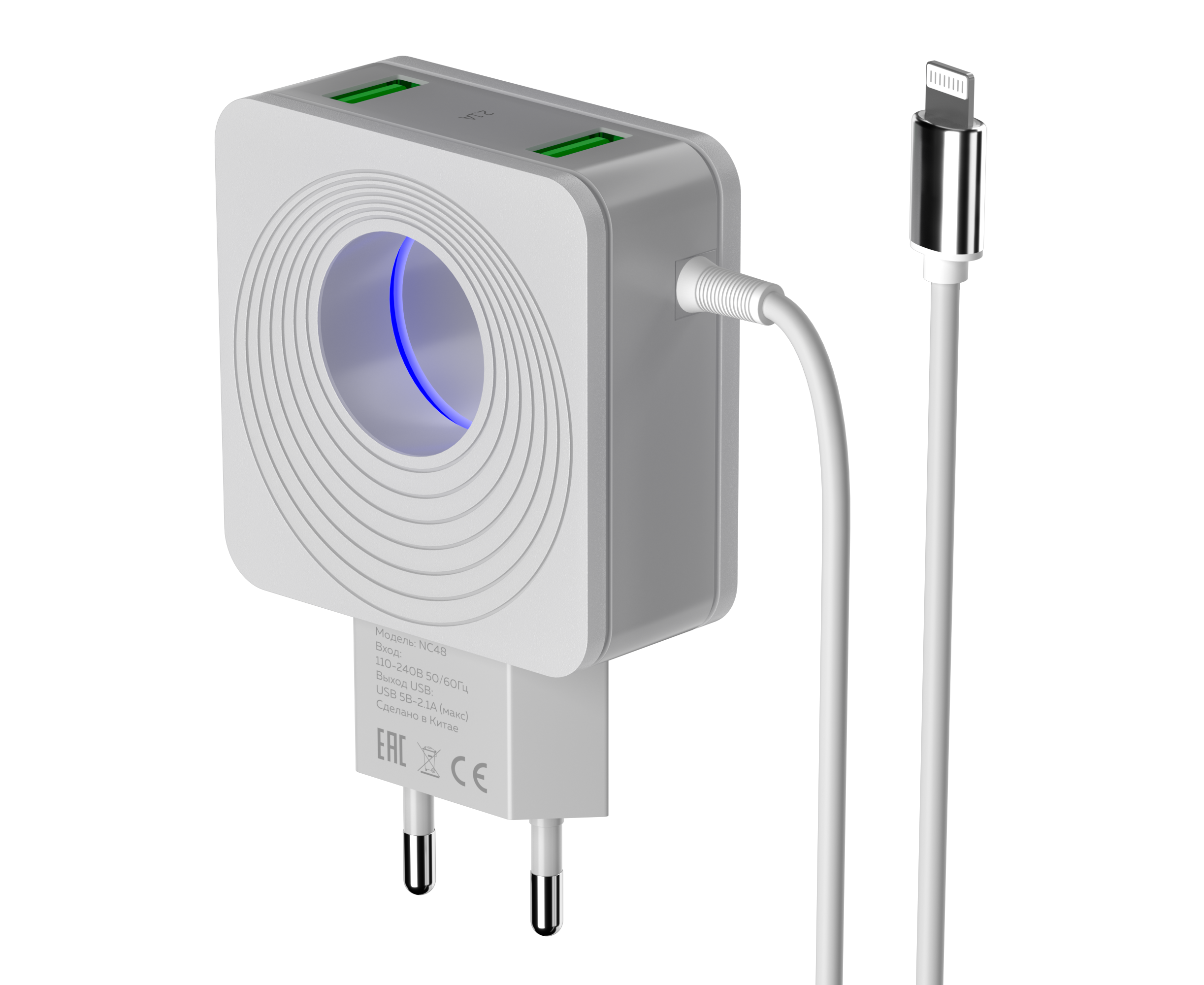 СЗУ 2USB 2.1A для Lightning 8-pin со встроенным кабелем и LED подсветкой More choice NC48i (White)