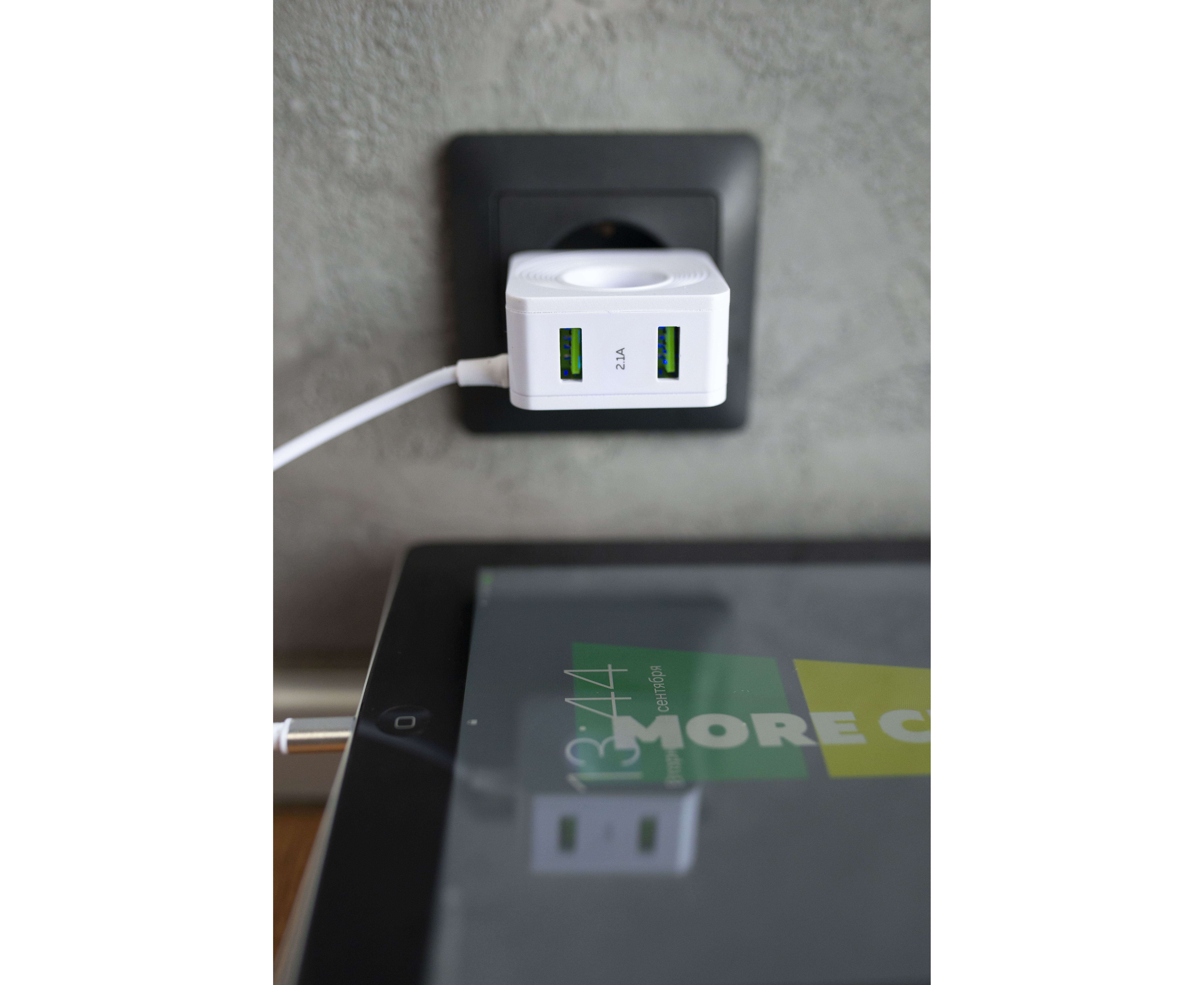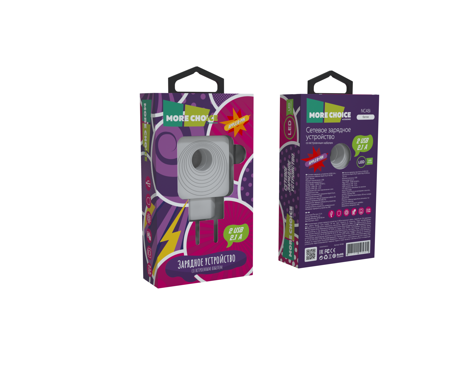 Материал: АВС-пластик Количество разъемов USB: 2 Вход: 100В/240В. Максимальный выходной ток: 2.1 A Кабель: встроенный Lightning 8-pin (1 м) Комплектация: сетевое зарядное устройство, держатель для кабеля, буклет Цвета: Black, White
