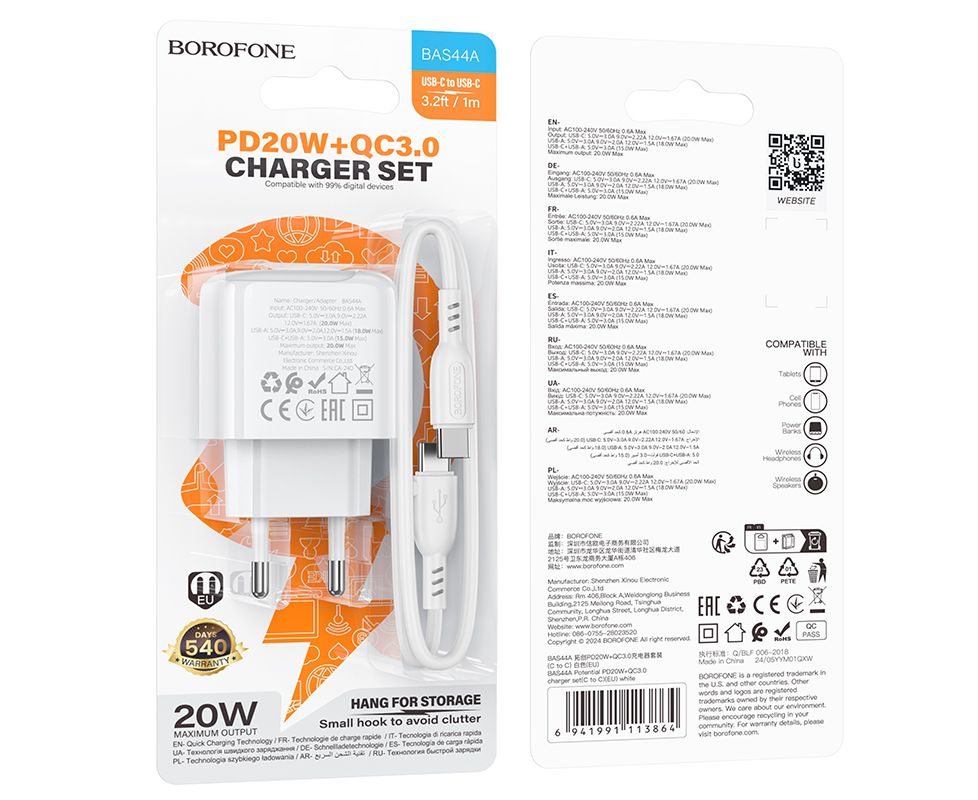 Универсальное сетевое зарядное устройство Borofone BAS44A для электронной техники с двумя встроенными портами для быстрой зарядки: USB-A + Type-C. Зарядное устройство подходит для быстрой и безопасной зарядки одновременно двух устройств. Адаптер легко можно взять с собой в автомобильное путешествие, компактный и практичный, он не займет много места и быстро зарядит ваши мобильные устройства. В комплекте поставляется зарядный кабель Type-C - Type-C длиной 1м.