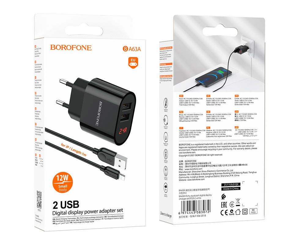 СЗУ BOROFONE BA63A Richy 2USB, 5V, 2.4A digital display + lightning (чёрный)