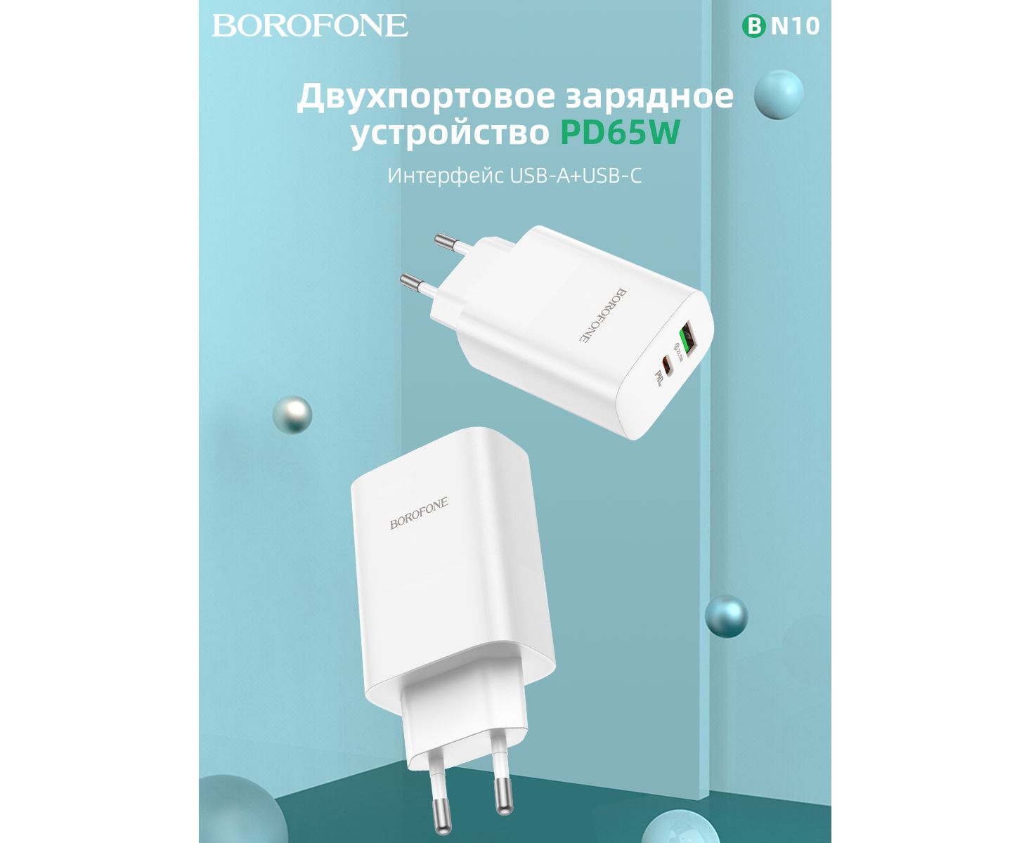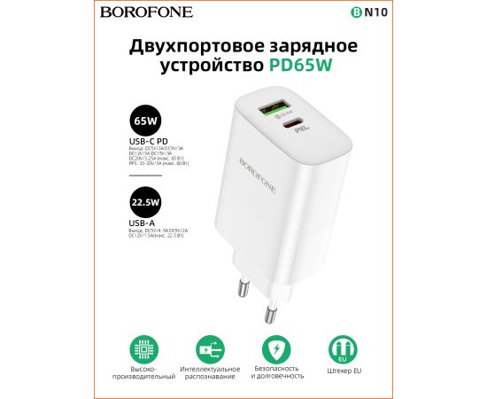 СЗУ BOROFONE BN10 Sunlight 2USB, PD65 (1A1C) (белый)