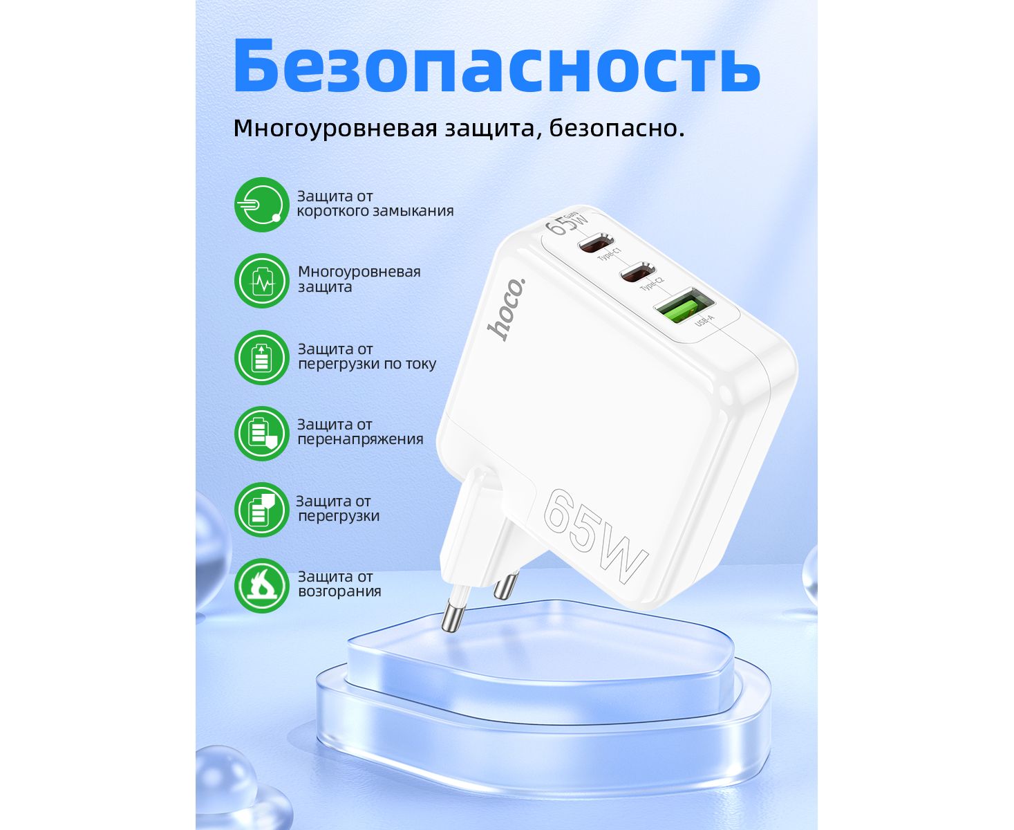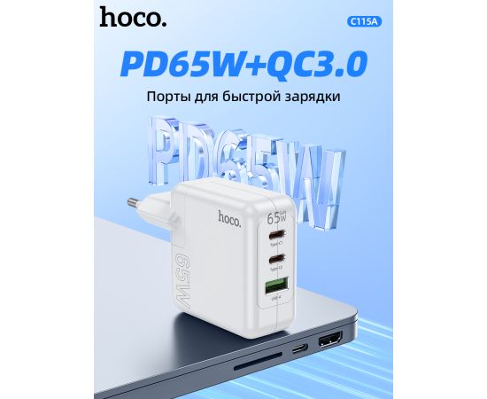 СЗУ HOCO C115A Header 3USB, PD65W, 2C1A charger set + Type-C to Type-C (EU) (белый)