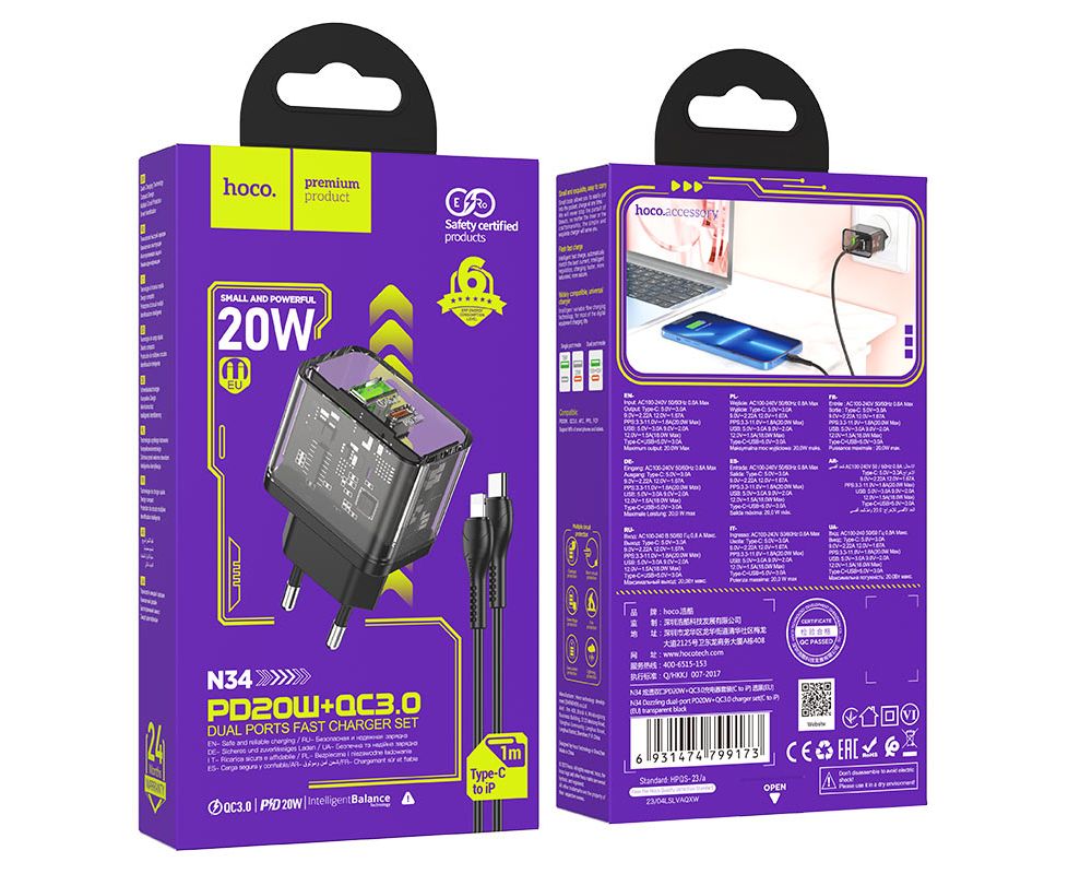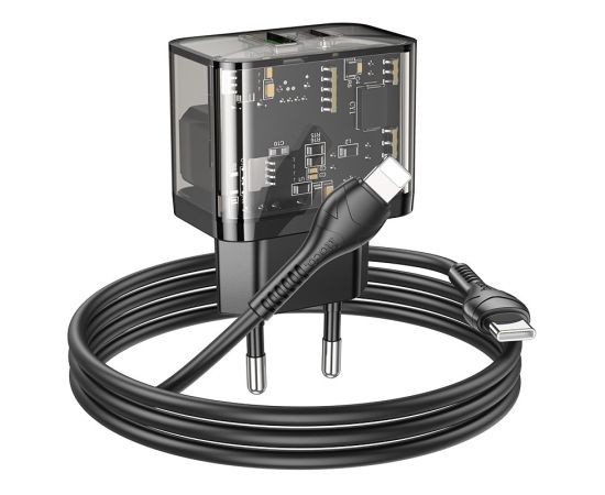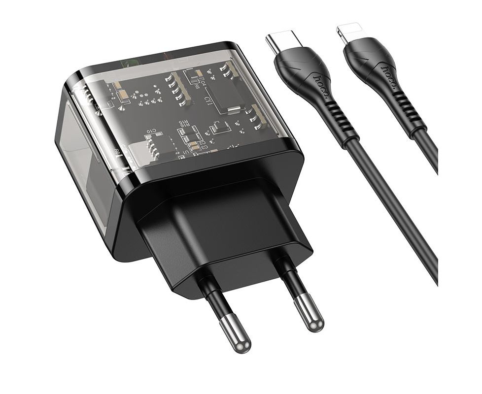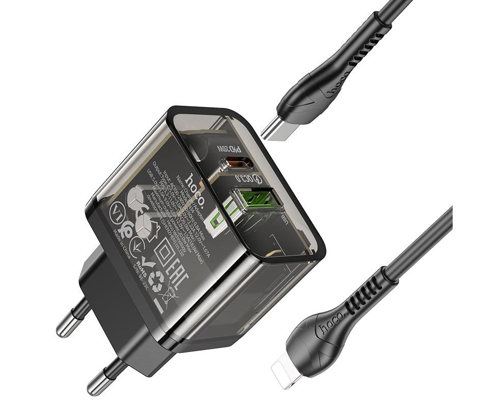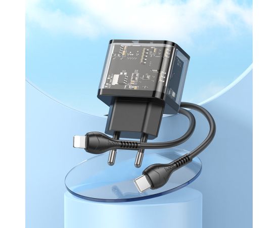 СЗУ HOCO N34 Dazzling dual-port USB-A+Type-C PD20W, Type-C to lightning (прозрачный-черный)