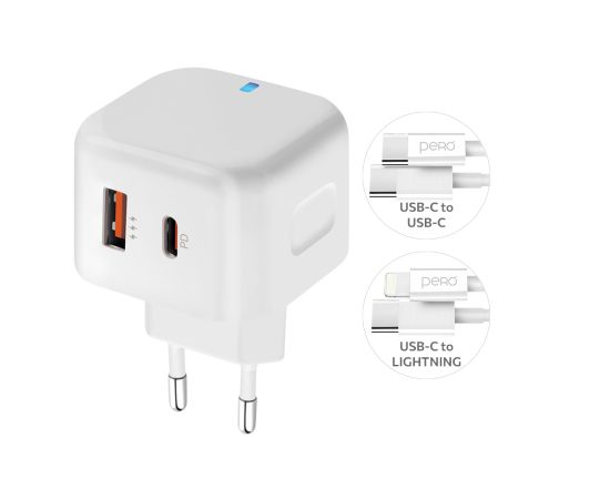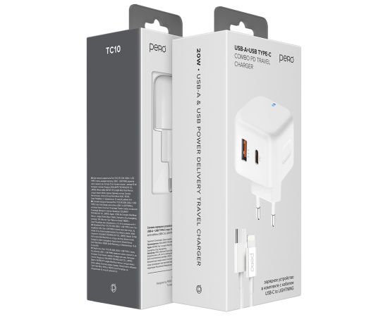 СЗУ PERO TC10 USB-C + USB-A c кабелем C to L в комплекте, 20W, белый