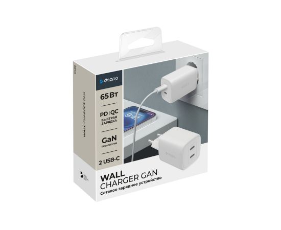 СЗУ 2xUSB-C, PD 3.0, QC 4.0, 65W, GaN, белый, Deppa