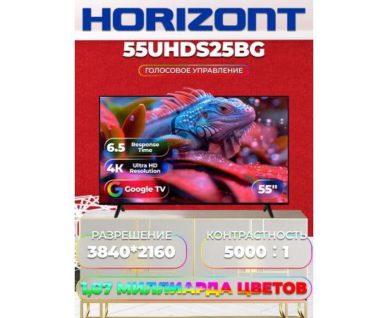 55" Телевизор Horizont 55UHDS25BG черный 3840х2160, 4K Ultra HD, 60 Гц, Wi-Fi, Smart TV, Google TV