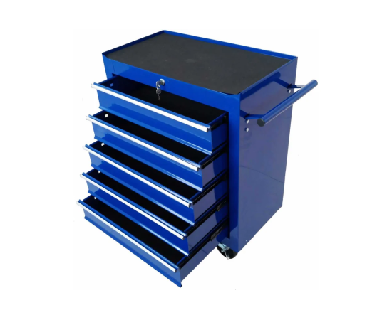Верхняя поверхность размером – 610*325 мм (Д/Ш), служит в качестве столика c бортиками, на котором можно размещать предметы. Дополнительно на столике размещен противоскользящий и противошумный коврик, которые защищают содержимое от повреждений и шума. Тележка оснащена пятью выдвижными ящиками, в которых можно разместить много вещей. Пять ящиков размерами (Д/Ш/Г) – 500х280х100мм. На лицевой панели каждого ящика установлена ручка-накладка. Каждый ящик снабжен клавишной системой антиоткрывания из оцинкованной стали, препятствующей самопроизвольному выдвижению ящиков, например, при наклоне или перемещении тележки. Для безопасности хранения ящики можно запирать на центральный замок (ключи в комплекте), который находится на центральной стороне ящика.