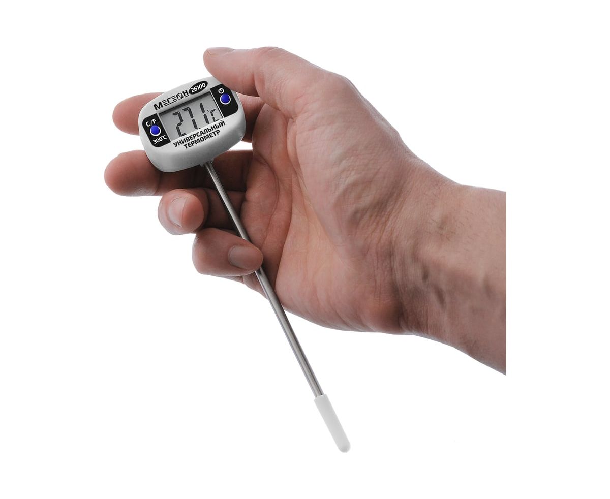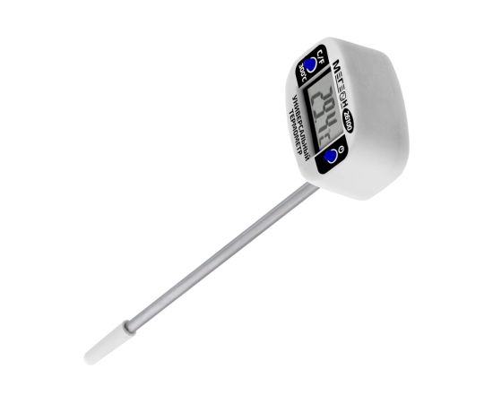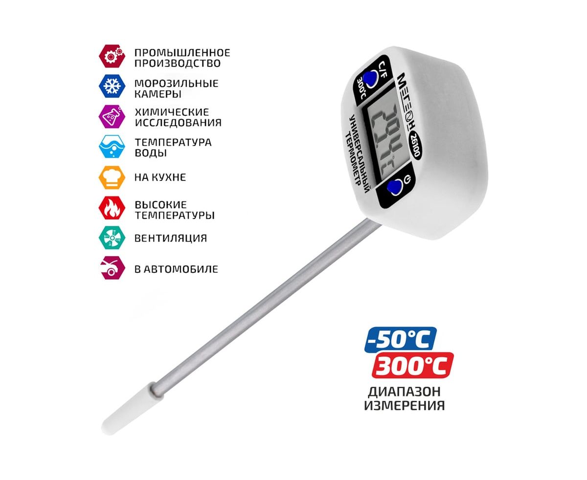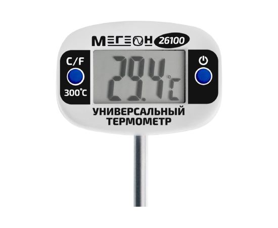 МЕГЕОН 26100 - новинка в модельном ряду цифровых термометров для промышленных и бытовых нужд. Представленная модель предназначена для замеров температуры с высокой точностью контактным методом в диапазоне -50 ... 300°C. Помимо этого изделие имеет вторую единицу измерения- Фаренгейты. Отличительной особенностью является возможность поворота экрана на 180°. Ручная установка единиц измерения и функция автоматического выключения при длительном простое, делают прибор более удобным в обращении. Зонд термометра изготовленный из нержавеющей стали, позволяет применять измеритель в отраслях связанных непосредственно с пищевыми продуктами, с нефтехимическими составами, с агрессивными жидкостями и материалами. Эргономичный дизайн и компактные размеры в полной мере смогут оценить профессионалы и любители.