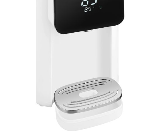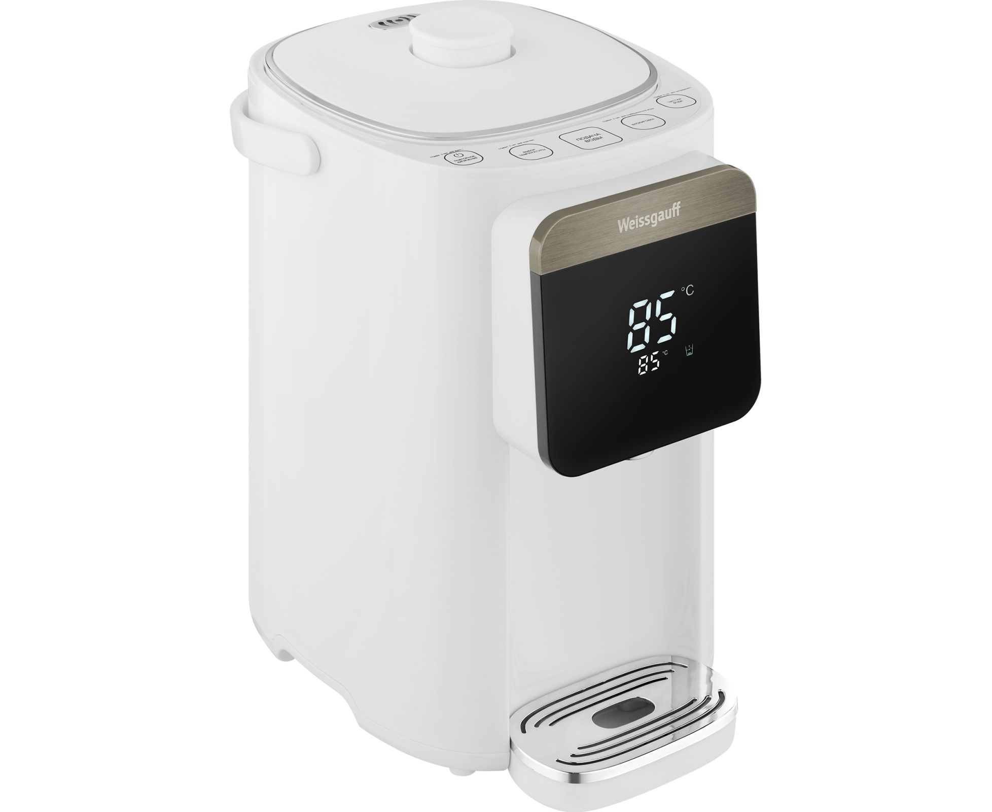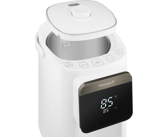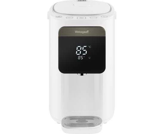 Вместительный и функциональный накопительный термопот от Weissgauff, выполненный в белом цвете, обладает баком для воды объемом 5 литров, возможностью поддержания требуемой температуры в диапазоне от 45 до 95 °C, а также 6 уровнями регулировки нагрева, функциями повторного кипячения, быстрой очистки и приготовления щелочной воды.