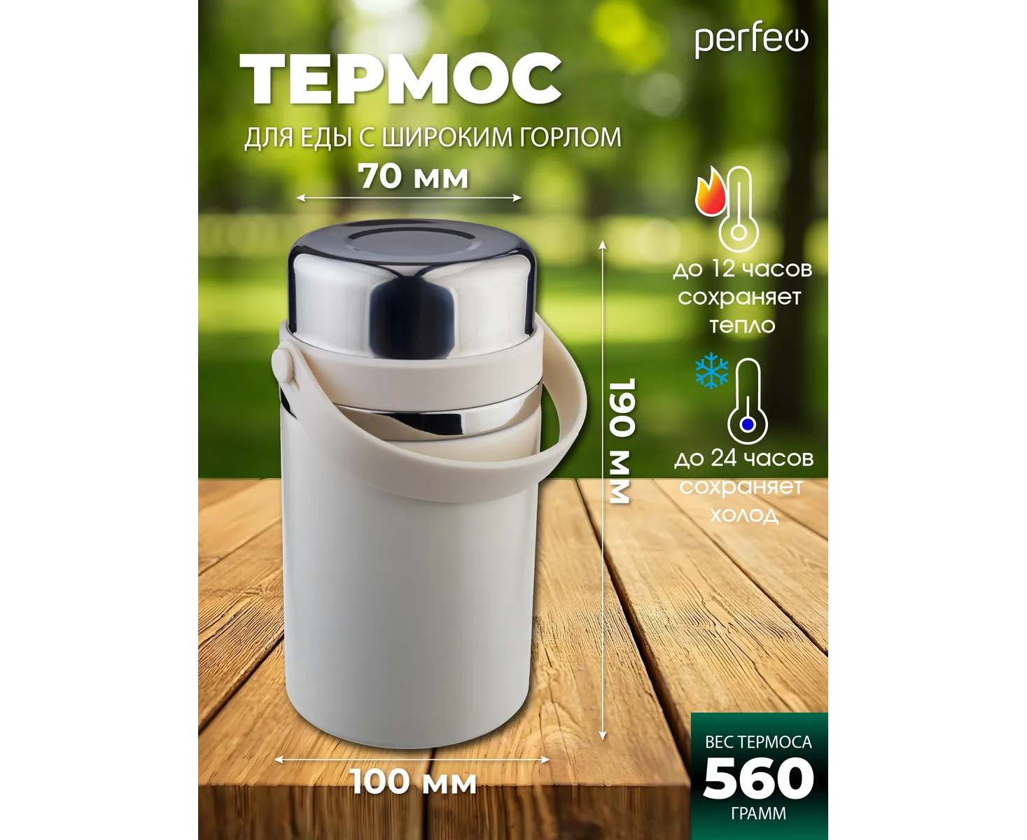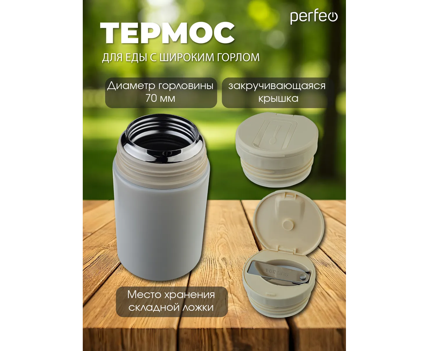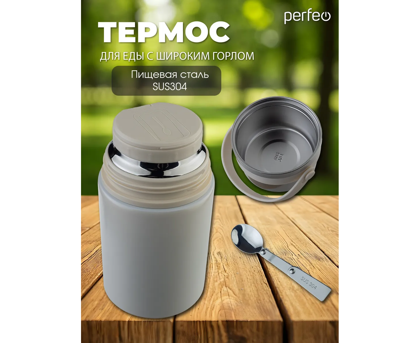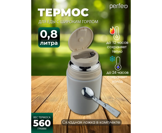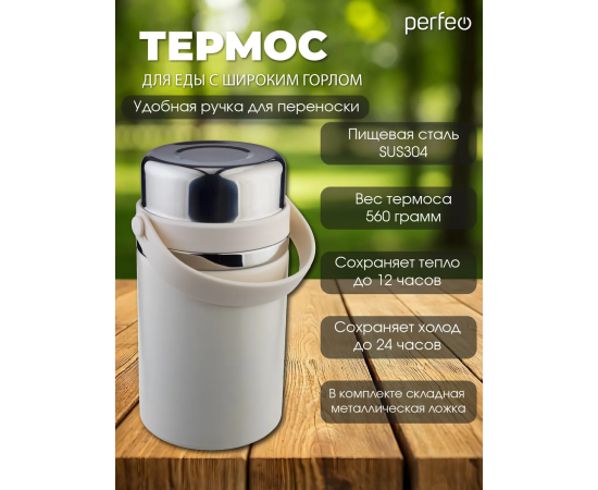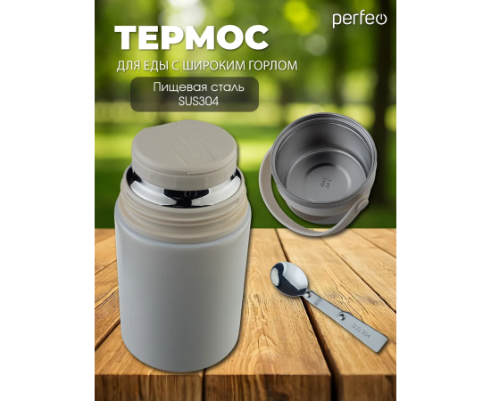 Термос для еды PERFEO с широким горлом, ручкой, ложкой, объем 0,8 л., молочный, (Арт. PF_E2321)