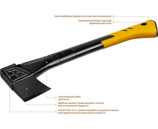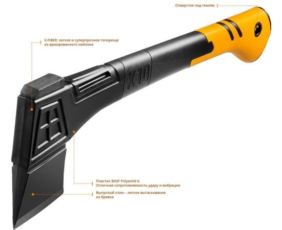 Описание X-FIBER: легкое и суперпрочное топорище из армированного нейлона. MAX POWER: Оптимальный баланс центра тяжести: максимальная сила удара. Выпуклый клин для легкого вытаскивания из бревна.