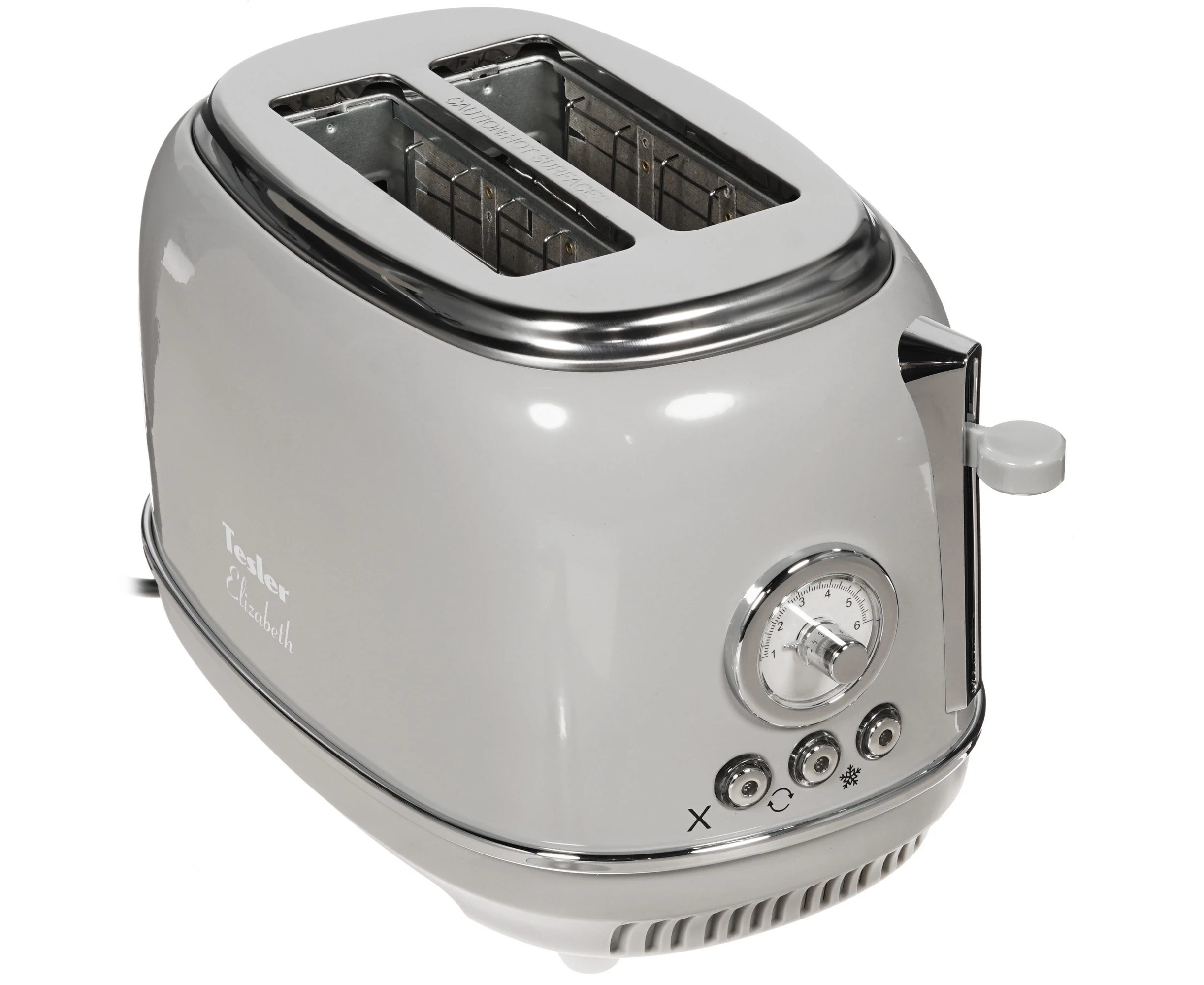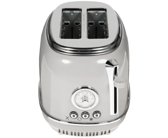 Тостер TESLER TT-245 выполнен в металлическом корпусе серого цвета. В нижней части имеется выдвижной съемный поддон, который облегчает очистку от крошек. Из других особенностей отмечаются отсек для удобного размещения кабеля, прорезиненные ножки и технология защиты от перегрева.