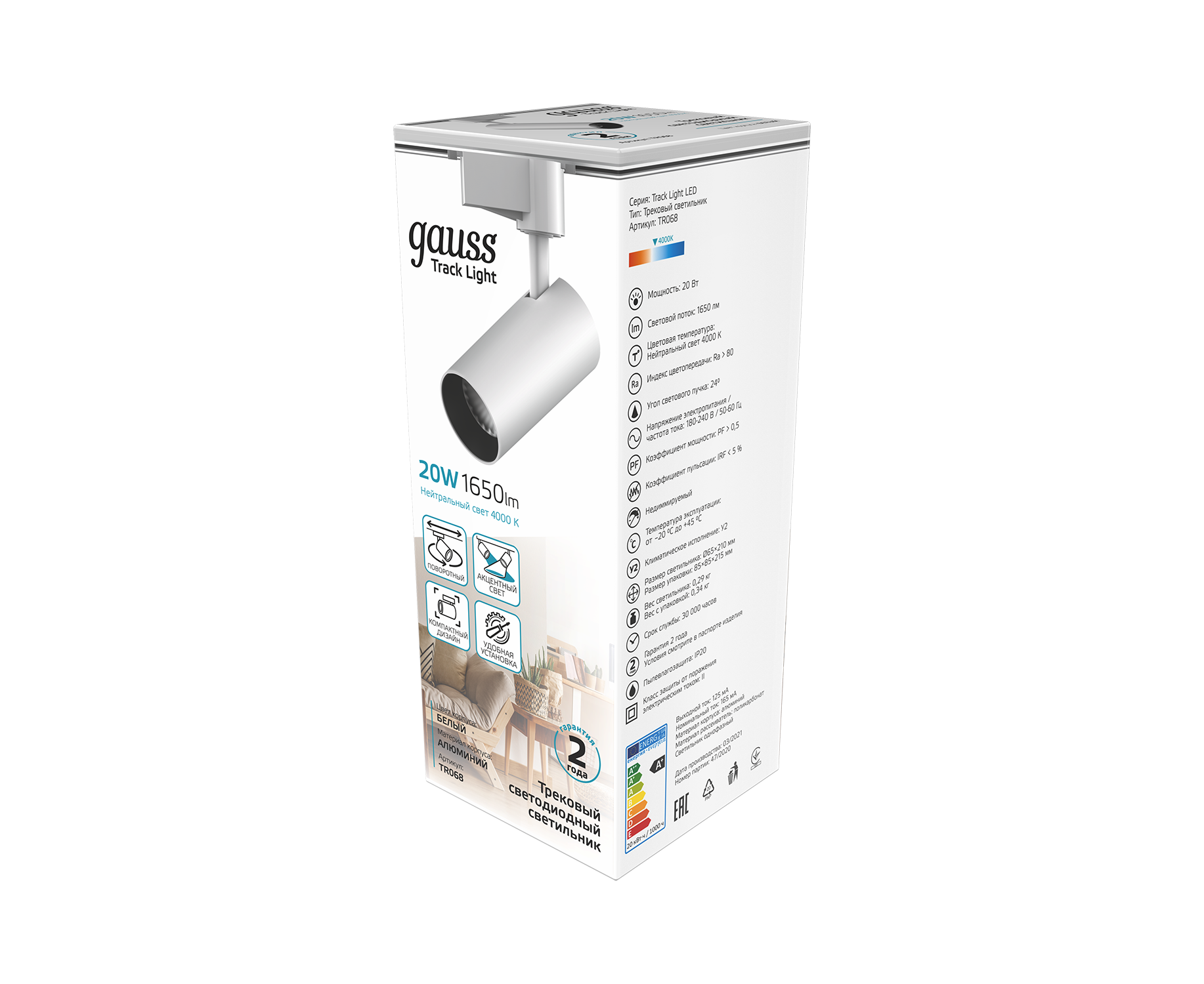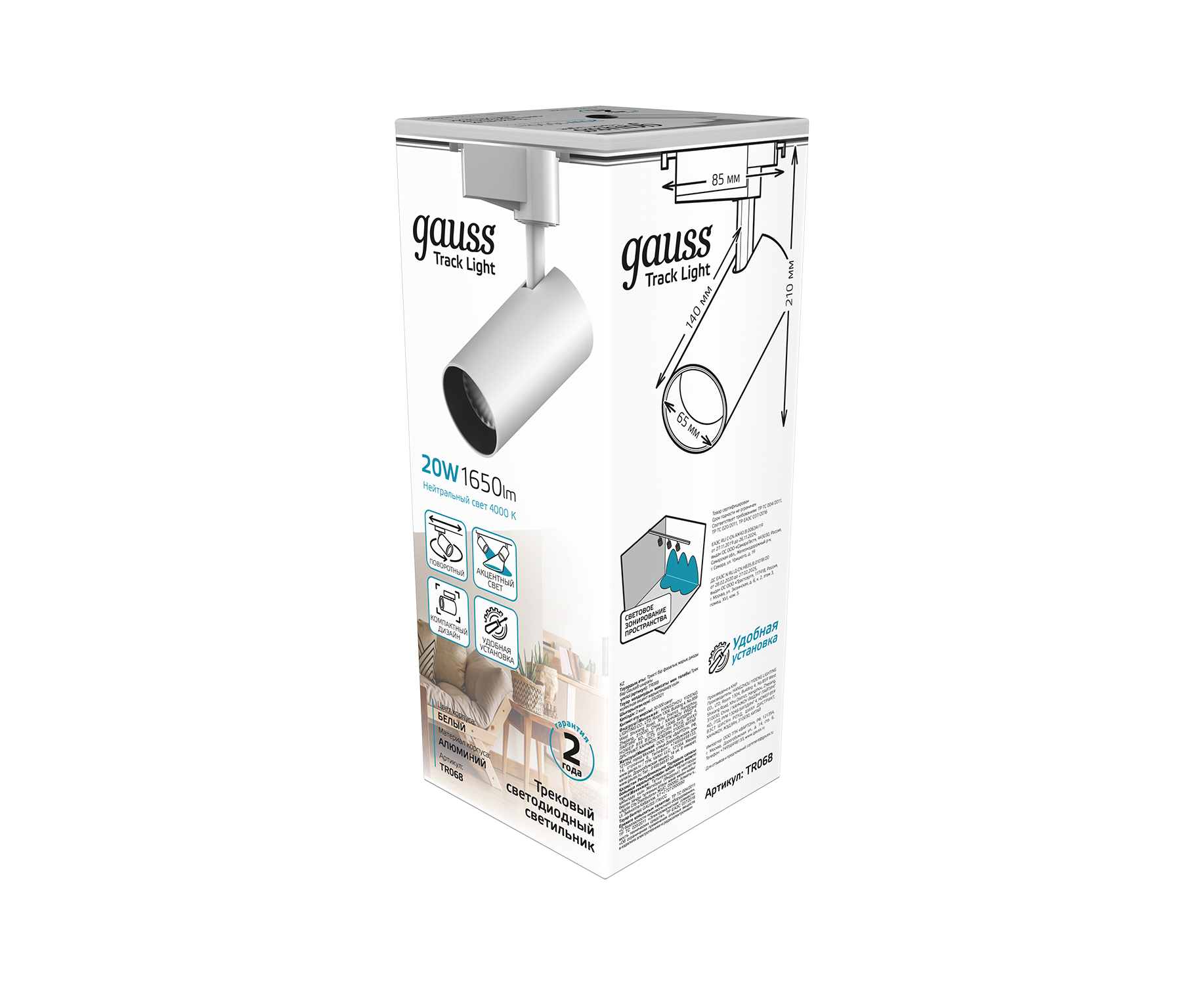 Светильник трековый Gauss цилиндр 20W TR068 предназначен для светового зонирования пространства, имеет внушительные характеристики при компактных размерах: световой поток 1650лм при угле рассеивания 24°. Цветовой диапазон 4000К представляет собой белый нейтральный свет, не влияющий на цветовосприятие человека. Спот прекрасно смотрится в спальне, кабинете, гостинной, гардеробной, прихожей. Отлично подчеркивает мебель, витрины, картины, декоративную отделку стен и прочие элементы требующие дополнительного светового акцента. Является элементом трекинговых систем Gauss.