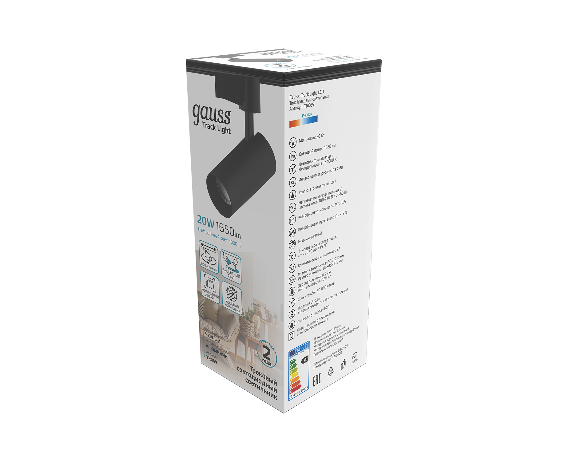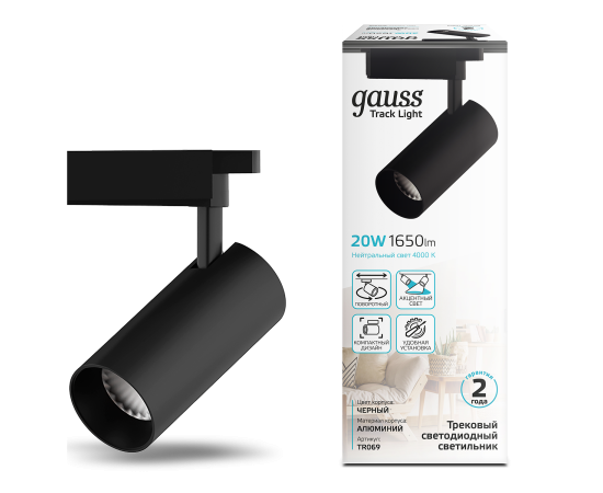 Светильник трековый Gauss цилиндр 20W TR069 состоит из алюминиевого корпуса с зеркальным рефлектором внутри и сатинированным рассеивателем. У него мощный световой поток 1650лм при угле рассеивания 24°. Светильник предназначен для акцентного освещения в разных зонах жилых, офисных и коммерческих помещений с сухим не запыленным воздухом. Может быть использован как соло, так и в комплексе с другими трек-спотами Gauss. Свет корпуса черный, цветовая температура 4000К (нейтральный белый свет).