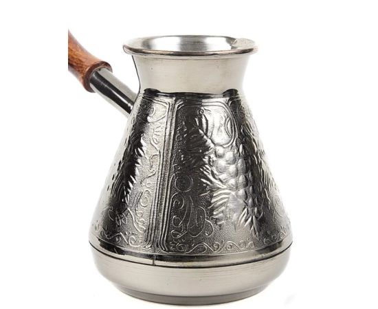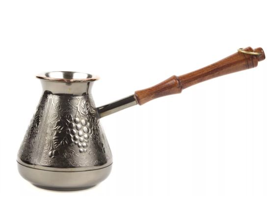 Медная турка классической конусообразной формы с утолщённым дном предназначена для приготовления ароматного натурального кофе. Внутренняя поверхность покрыта пищевым оловом. Наружная сторона украшена оригинальным орнаментом.