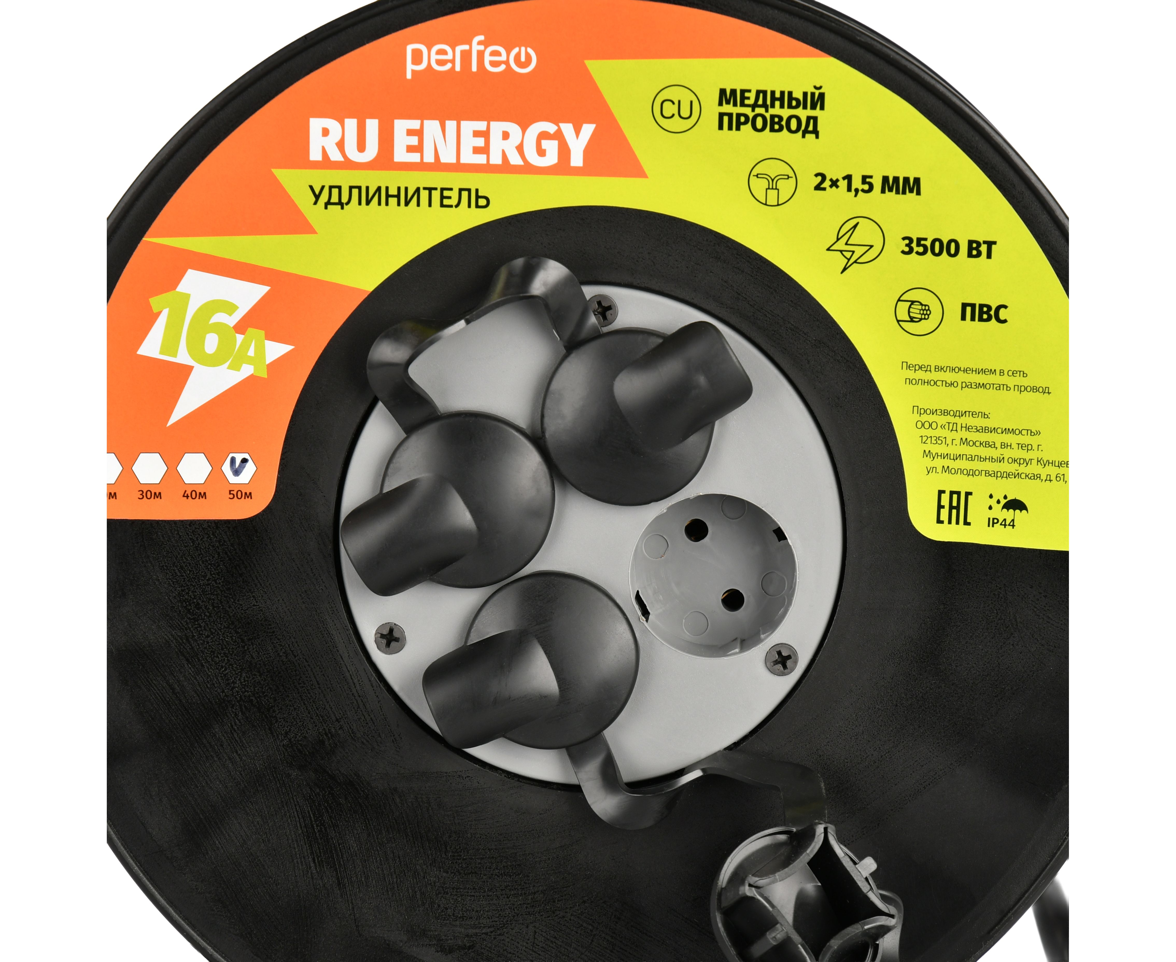 Удлинитель на катушке без заземления Perfeo "RU ENERGY" 40м 4гн 16А ПВС 2х1,5 IP44, (Арт. PF_E2532)
