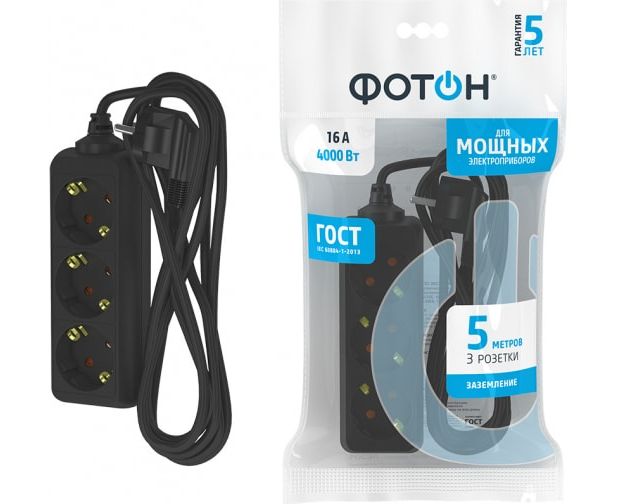 Удлинитель сетевой ФОТОН 22724 16-53Е, 5м, 3 розетки, 16А, с заземлением,черный