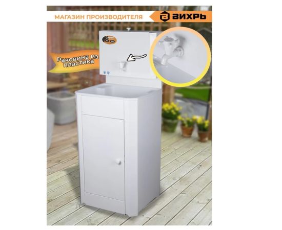 Умывальник ВИХРЬ отличается особой функциональностью, так как его можно установить как внутри дома, так и снаружи. Внутри тумбочки ставиться ведро или шланг для слива воды. Так как в таком умывальнике есть раковина, то его можно свободно использовать для мытья посуды.