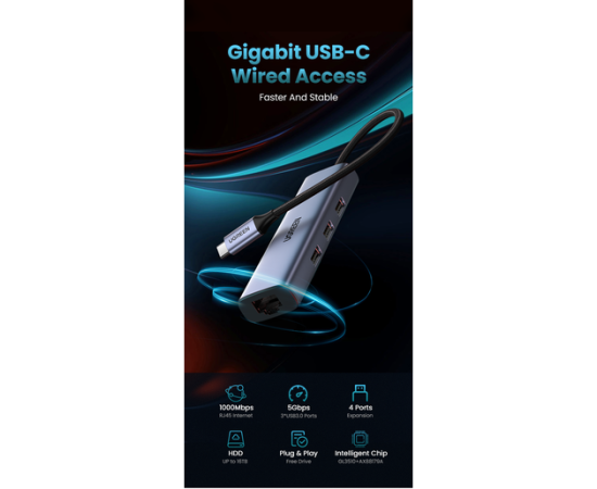 USB Hub UGREEN CM475 60600 Type C to 3*USB 3.0 + RJ45 gigabit Converter without power port