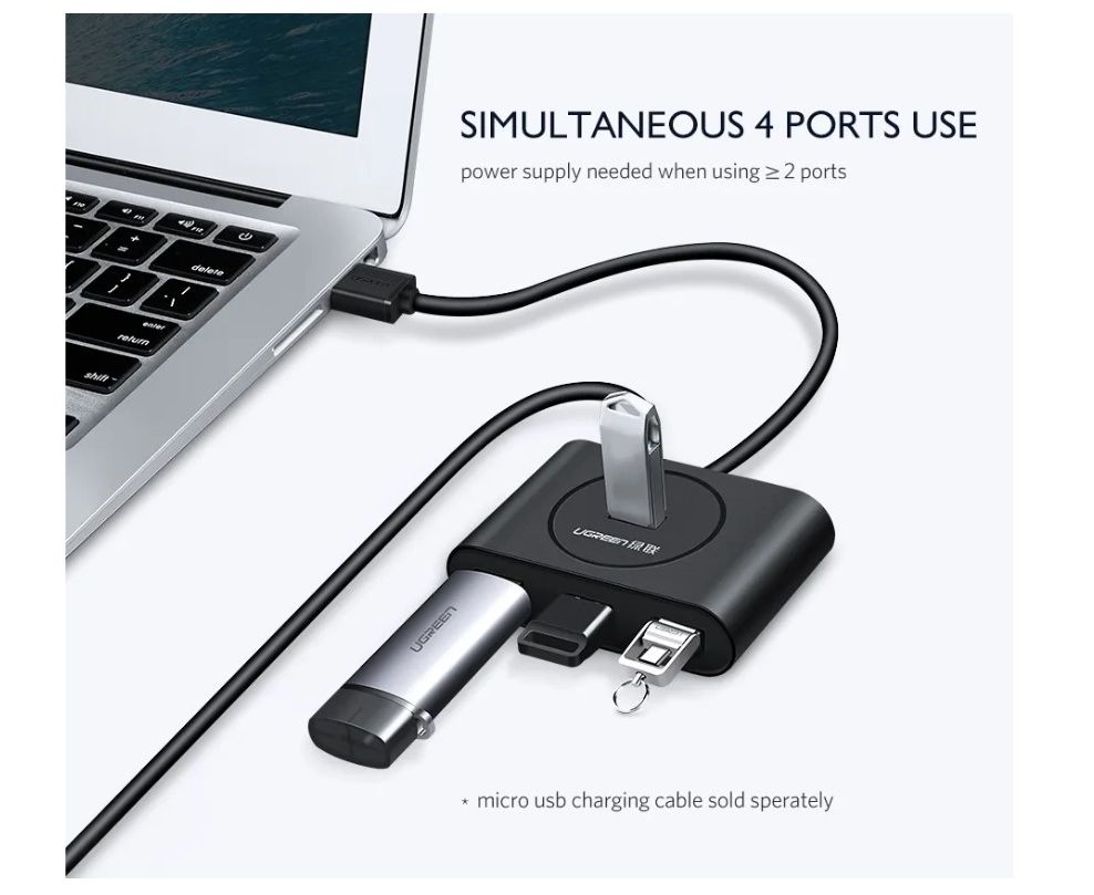 Дополнительный интерфейс питания micro USB на задней панели концентратора поможет вам обеспечить дополнительное питание при подключении мощных устройств, таких как жесткий диск большой емкости, для его зарядки можно использовать зарядное устройство для смартфона.
