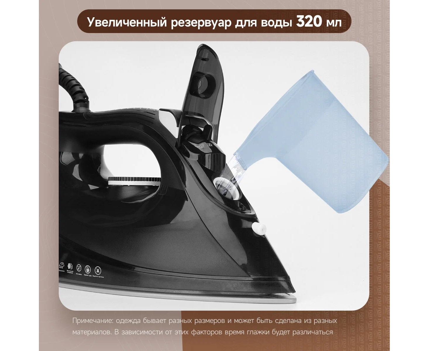 Особенности утюга, отпаривателя: Противокапельная система, Очистка от накипи, Распылитель для воды, Функция самоочистки, Вертикальное отпаривание