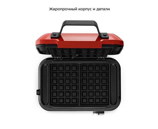 Электрическая вафельница имеет корпус, выполненный из прочного термоустойчивого пластика. В вафельнице установлены нагреватели в каждой половине. Прорезиненные ножки не дают прибору скользить по столу во время готовки.