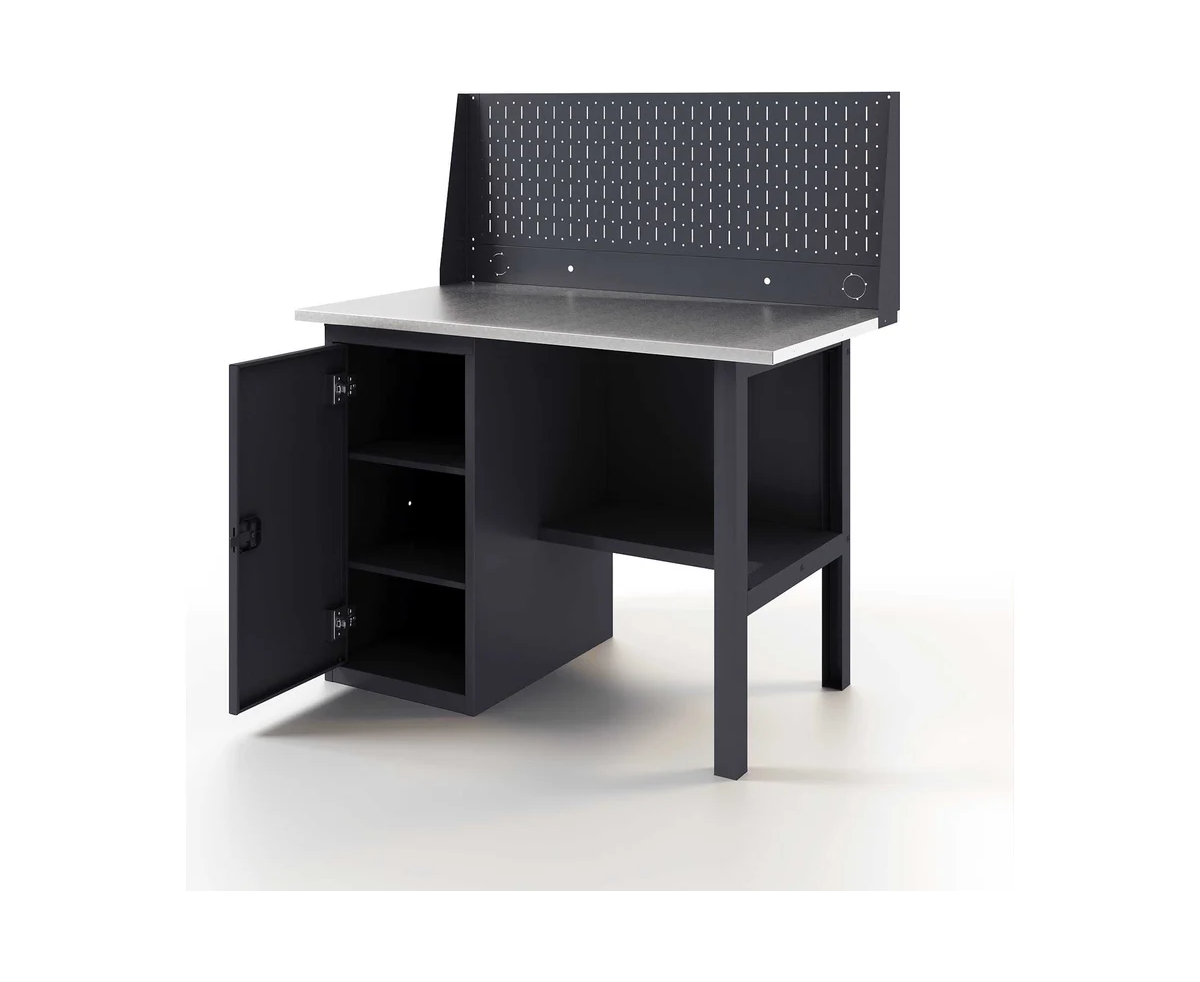 Верстак-стол - устойчивый, удобный, для слесарных, столярных работ, для производств и мастерских. Поставляется в разобранном виде. Крепкая и надежная конструкция столешницы из дерева и металла выдерживает нагрузку до 300 кг. Специальное полимерное покрытие на ножках и полке защищает от коррозии и придает столу эстетичный вид. Надежная и прочная конструкция стола , позволяет выполнять даже силовые операции с инструментом и металлоизделиями. Столешница представляет собою плиту из фанеры толщиной 24 мм, закрытую коробом из оцинкованного листа толщиной 1,2 мм. Конструкции столешницы и короба разработаны таким образом, чтобы после сборки верстака на его рабочей поверхности отсутствовали неиспользуемые отверстия для крепежных элементов, головки болтов, заклепок и т. д. Поверхность столешниц идеально ровная. Это обеспечивает дополнительный комфорт пользователю. Опора для верстаков и столов из холоднокатаной стали 1,5 мм, согнутой в П-образный профиль. Цвет серый RAL 7024. Перфорированная панель служит для размещения инструментов, крепежа и расходных материалов. Отверстия имеют диаметр 5 мм с шагом перфорации 50 мм. Перфорированная панель комплектуется дополнительной панелью для установки розеток, тумблеров и выводов компрессора.