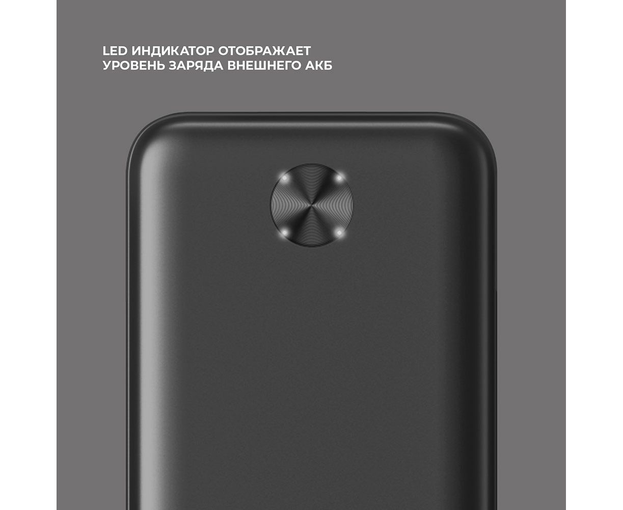 Внешний аккумулятор 20000 мА-ч, оснщенный светодиодным индикатором уровня заряда. Выполнен в прочном пластиковом корпусе.