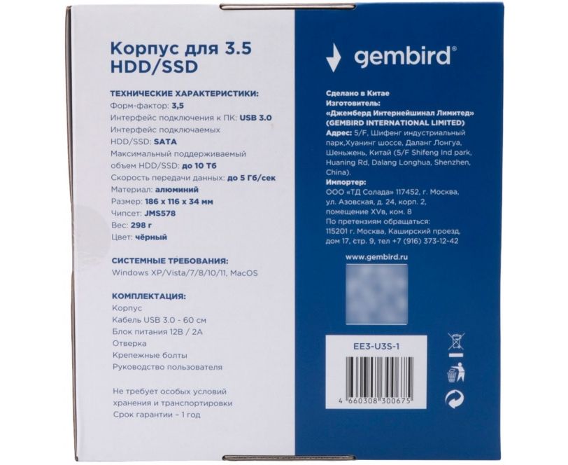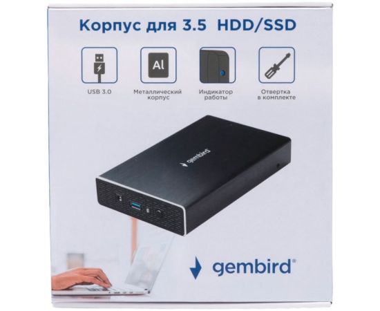 Внешний корпус Gembird EE3-U3S-1 USB 3.0 для 3.5" HDD/SSD Gembird, порт Type-A, SATA III, металл, чёрный