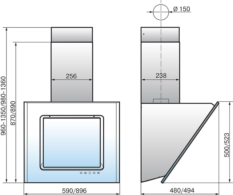 Особенности: Прогрессивные сенсорные датчики, защищенные стеклом, гарантируют безупречное переключение режимов работы кухонной вытяжки простым прикосновением, выбранный режим отображается на дисплее.