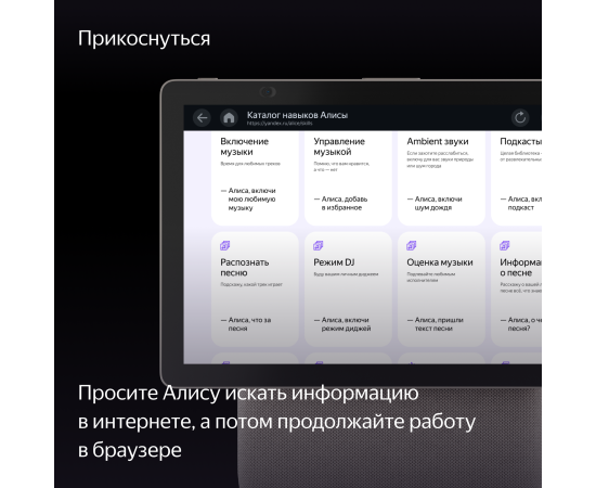 Просите Алису искать и включать музыку, фильмы или сериалы¹, а потом управляйте контентом на экране касаниями: перематывайте, ставьте на паузу и выбирайте нужное. Смотрите телеканалы. Задавайте Алисе вопросы — и не только слушайте её ответы, но и смотрите их на экране. Или пользуйтесь браузером.