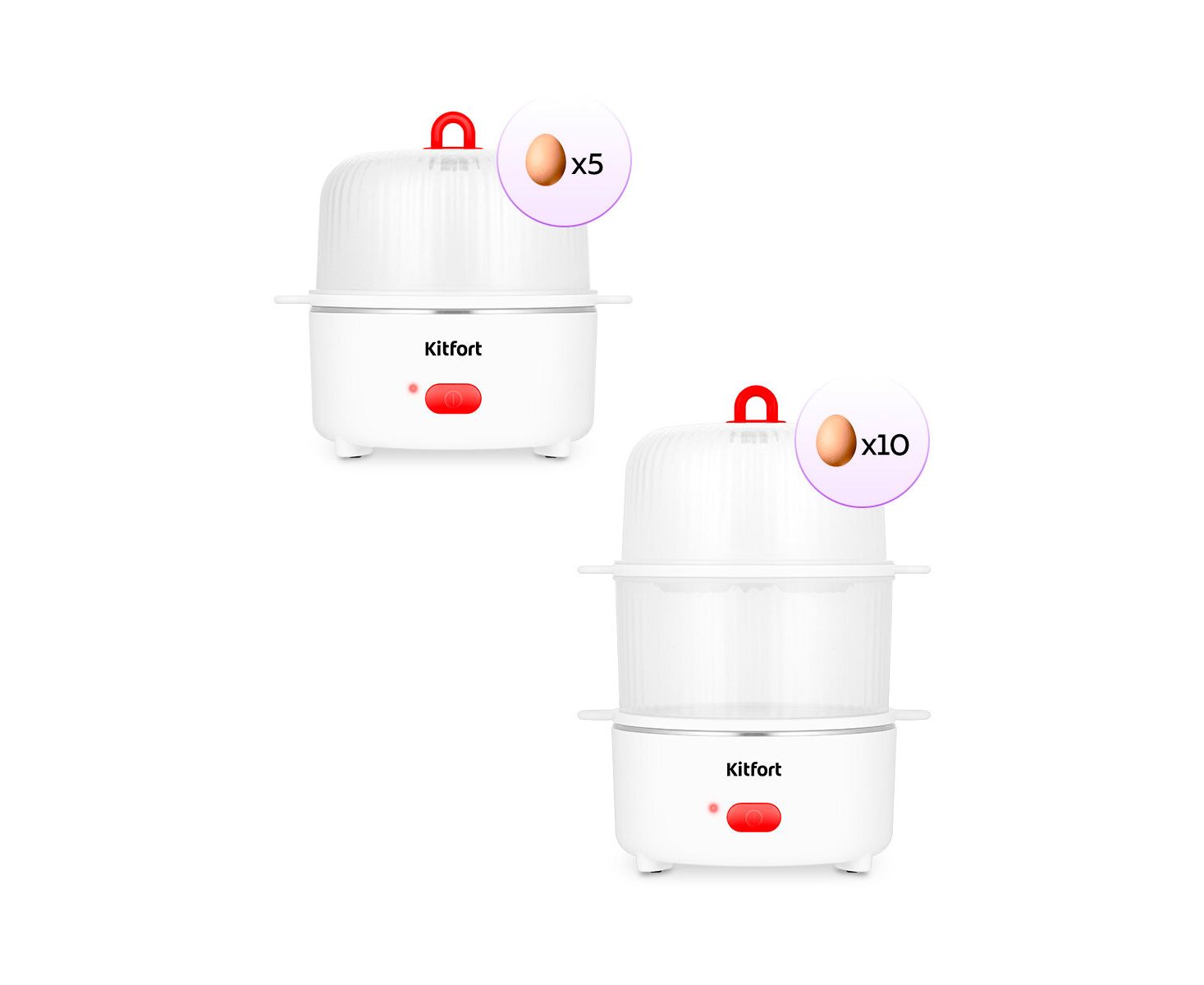 На яйцеварку устанавливается основание, которое закрывается крышкой с ручкой, чтобы готовить до 5 яиц. На основание можно установить паровой отсек, на отсек – второе основание и накрыть крышкой: так у яйцеварки будет 2 уровня для приготовления (6-10 яиц).