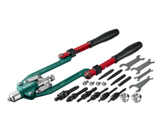 Применяется для установки вытяжных и резьбовых заклепок, а также резьбовых штифтов. Используется с вытяжными заклеками: алюминиевые и стальные - 3,2, 4,0, 4,8, 6,0, 6,4 мм, нержавеющие - 3,2, 4,0, 4,8, 6,0 мм, резьбовыми заклепками: алюминиевые М4, М5, М6, М8, М10, М12, стальные М4, М5, М6, М8, М10, нержавеющие М4, М5, М6, М8, резьбовыми штифтами: алюминиевые и стальные М4, М5, М6, М8, нержавеющие М4, М5, М6, М8.