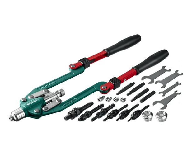 Комбинированный складной заклепочник работает с тремя видами крепежа - вытяжными заклепками, резьбовыми заклепками, резьбовыми штифтами