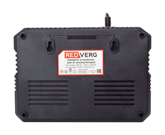 Зарядное устройство для 2-х аккумуляторов 18 В, 4 Ач REDVERG 6678956 предназначено для зарядки литий-ионных аккумуляторов REDVERG единой 18В платформы с 5 аккумуляторными ячейками (банками) общим напряжением до 21 В.
