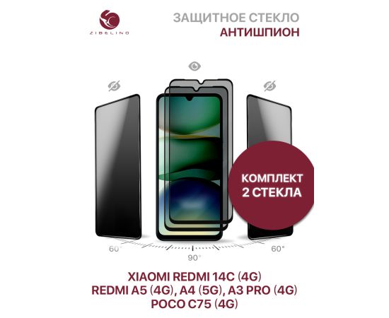 Защитное стекло антишпион (комплект 2шт) на Xiaomi Redmi A5 (4G), 14C (4G), Redmi A3 Pro (4G), A4 (5G), Poco C75 (4G) полноэкранное, с рамкой (Ксиоми Редми А5 14C А3 Про А4 Поко С75)